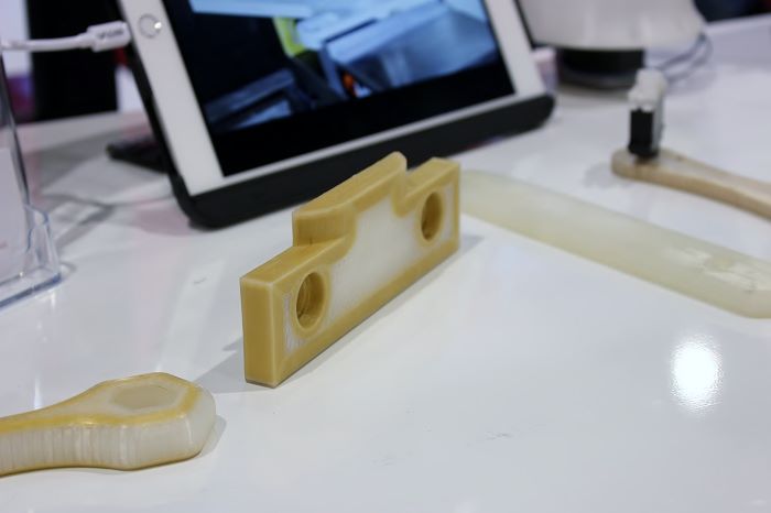 Greg Mark, ceo van Markforged, was vorige week prominent aanwezig op SolidWorks World 2015 in Phoenix (VS), de jaarlijkse conferentie voor gebruikers van SolidWorks en andere softwaretools van Dassault Systèmes. De 3D-printer van de Amerikaanse start-up print onder andere lange koolstofvezels in combinatie met nylon 12. Sinds kort heeft hij ook Kevlar aan het materialen portfolio toegevoegd. Door aan beide zijden van het werkstuk een dunne laag van een vezelversterkte kunststof te printen, of door in een nylon printdeel carbonvels te printen, worden de producten 20 keer stijver dan ABS en krijgen ze mechanische sterktes vergelijkbaar met aluminium.