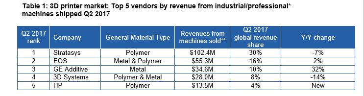 In de kunststoffenmarkt leiden Stratasys en 3D Systems nog steeds. HP begint echter de dringen. Volgens de Context analist is HP klaar om in de 2e helft van het jaar te gaan groeien. Hij verwijst onder andere naar de samenwerking van HP met Deloitte. 3D Systems zag het marktaandeel in het tweede kwartaal afnemen met 22 procent; Stratasys met 7 procent. EOS, dat zowel kunststoffen als metaal doet, was de enige van de gevestigde orde die het marktaandeel met een kleine 2 procent wist te verbeteren. In de omzetcijfers heeft Context ook de omzet uit spupplies mee gerekend.
