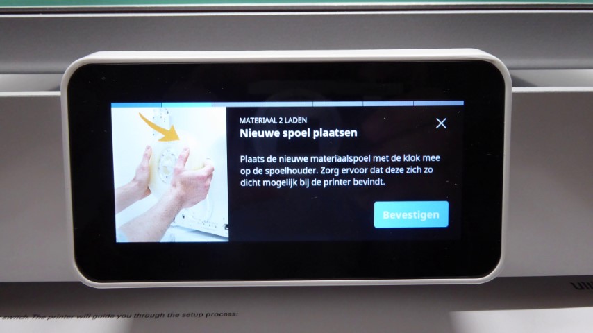 Een praktisch minpunt vind ik het plaatsen van een nieuwe spoel met filament. Ultimaker kiest er nog steeds voor om beide filamentspoelen op één spoelhouder te plaatsen. Dit betekent dat als je de achterste filamentrol moet verwisselen, je ook de voorste moet afnemen. Met een beetje handigheid lukt dit zonder het filament ook daadwerkelijk uit de extruder te verwijderen, maar twee houders zou gemakkelijker zijn geweest. Ultimaker spoelen zijn tegenwoordig voorzien van een chip voor herkenning. Eerlijk gezegd heeft het bij mijn printer even geduurd voordat het filament herkend werd. Gelukkig is het handmatig instellen van het materiaal gemakkelijk. Je kunt heel snel door de menu-instellingen bladeren via het aanraakscherm aan de voorzijde. Tot nog toe heb ik daar geen enkele keer een vertraging in ervaren. Tijdens het printen zie je op het scherm de tijd dat de print nog duurt en kun je nog eens naar het model swipen.