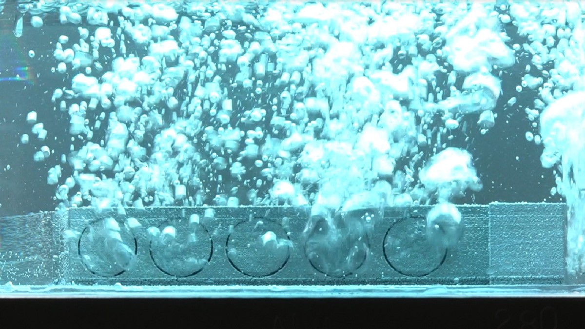“We brengen hiermee een nieuwe functionaliteit naar 3D printen”, zegt Andreas Vogelpoth van de LPBF Process and Systems Engineering Group bij het Fraunhofer ILT. Op de laserbeurs in München demonstreert het onderzoeksinstituut deze ontwikkeling door een onderdeel met een poreuze structuur onder te dompelen in een bak met water en daar lucht door heen te blazen. De permeabele structuren zijn reproduceerbaar. Op dit moment werken de onderzoekers aan het nauwkeurig sturen van de doorlaatbaarheid door de procesmeters van het AM-proces te veranderen. Een van de concrete toepassingen is de productie van een electrolyser voor de productie van waterstof.
