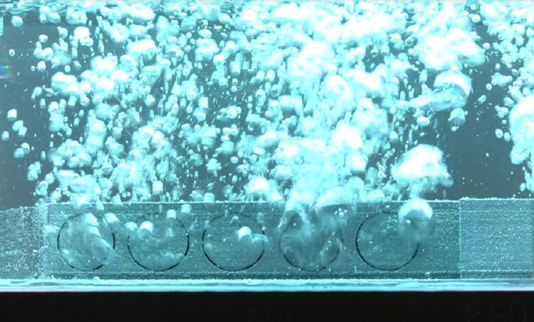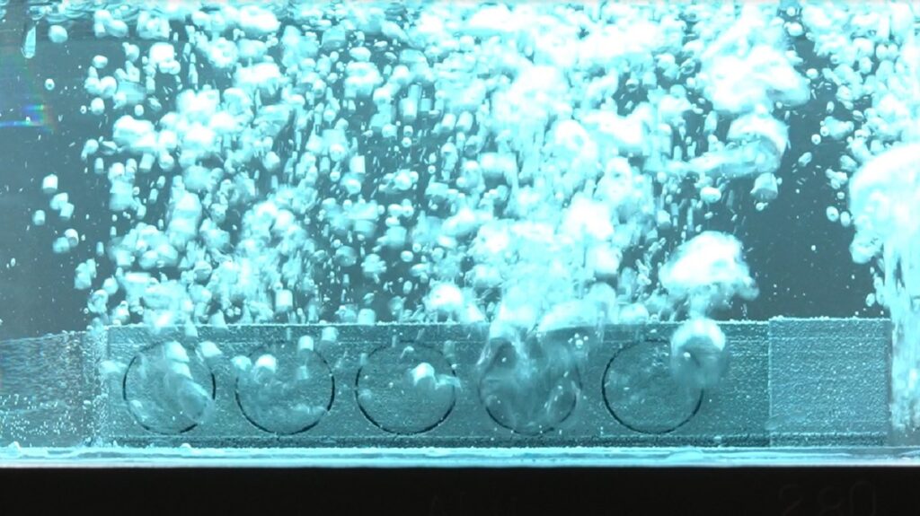 “We brengen hiermee een nieuwe functionaliteit naar 3D printen”, zegt Andreas Vogelpoth van de LPBF Process and Systems Engineering Group bij het Fraunhofer ILT. Op de laserbeurs in München demonstreert het onderzoeksinstituut deze ontwikkeling door een onderdeel met een poreuze structuur onder te dompelen in een bak met water en daar lucht door heen te blazen. De permeabele structuren zijn reproduceerbaar. Op dit moment werken de onderzoekers aan het nauwkeurig sturen van de doorlaatbaarheid door de procesmeters van het AM-proces te veranderen. Een van de concrete toepassingen is de productie van een electrolyser voor de productie van waterstof.