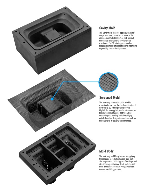 De screened mold, die in het proces gebruikt wordt om overvloedig water te verwijderen van de vezelslurry, draagt bij aan het terugdringen van het aandeel handwerk in de productie van de verpakkingen. De body van de matrijs wordt gebruikt om druk te zetten tijdens het vormen van de verpakking. Farsoon zegt dat de 3D geprinte matrijs tot een betere maatnauwkeurigheid leidt en meer uniforme detaillering.