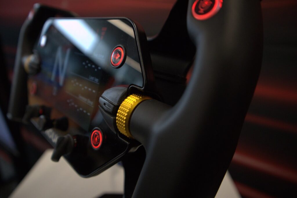 Als bezoekers op de Kunststoffenbeurs in de O-Rouge racesimulator stappen, is het stuurwiel waarschijnlijk het eerste dat ze opvalt. Er zitten 7 hoogwaardige drukknoppen op, 2 encoders, 2 kantelschakelaars en schakelpaddels van koolstofvezel om je dezelfde sensaties te geven als in een echte racewagen. Wat bezoekers niet meteen zien, is dat het stuurwiel meer dan 30 geprinte onderdelen bevat.