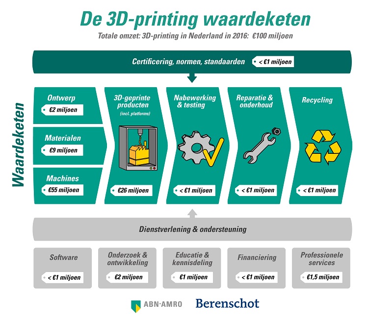 Berenschot en ABN Amro hebben opnieuw de Nederlandse markt voor 3D printen in kaart gebracht. Ze schatten dat er vorig jaar in totaliteit 100 miljoen euro werd omgezet met 3D printen. Een verdubbeling ten opzichte van 2014. Dit jaar zien ze de markt doorgroeien naar 120 miljoen euro. Cijfers zijn mede gebaseerd op de online database van 3D-Print Atlas. Het cijfer weerspiegelt de totale waardeketen, dus ook de omzet bij filamentproducenten en 3D print servicebedrijven.
