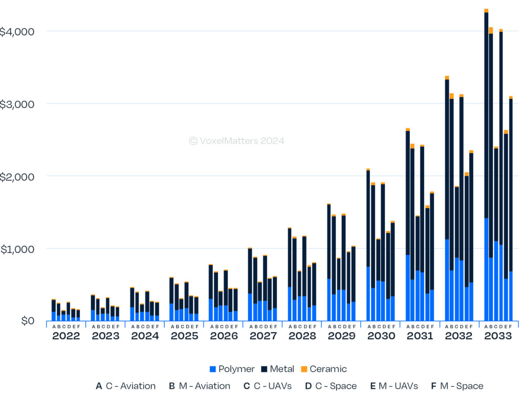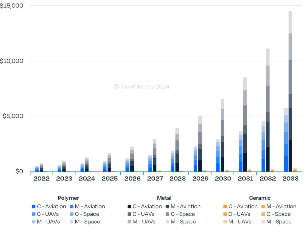 Metalen AM-producten zullen de AM-markt voor de lucht- en ruimtevaart blijven domineren. Deze dominantie wordt zelfs nog groter. VoxelMatters verwacht dat tegen 2033 ruim 70% van de AM-markt in de aerospaceindustrie te maken heeft met metaal AM. De totale omvang van dit segment wordt verwacht te groeien naar $ 14,5 miljard in 2033, tegenover $ 978 miljoen in 2023. De analisten van VooxelMatters schatten in dat de grootste groei zal zijn bij de gebruikers van metaal AM, de bedrijven die de componenten 3D printen. Zij zullen in 2033 goed zijn voor 39,5% zal bijdragen aan de totale omzet in dit segment; een groei van 32,3% CAGR. De AM-markt voor kunststoffen in de lucht- en ruimtevaartindustrie groeit naar een omvang van $5,7 miljard; die van technisch keramiek naar $310 miljoen (in 2023 was dit $17 miljoen).