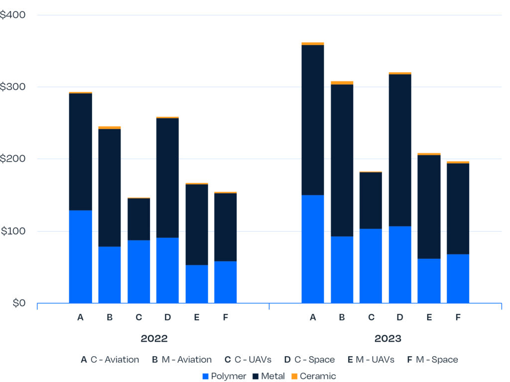 Niet onverwacht domineert metaal additive manufacturing de lucht- en ruimtevaartvaartindustrie. 62% van de $1,58 miljard die de sector verleden jaar besteedde aan AM, ging naar metaal. Kunststoffen heeft een aandeel van 36,9%. Binnen het metaal AM-segment genereerden gebruikers 50,3% van de omzet, met een geschat totaal van 492 miljoen dollar. Onderdelen voor de luchtvaart (zowel civiel als defensie) genereerden de hoogste inkomsten, waarbij hardware $196 miljoen (12,4%) bijdroeg en diensten $214 miljoen (13,5%). Materialen waren goed voor 7,8% van de metaalomzet en stegen met 35,9%. Polymeer AM had een significante impact in civiele UAV’s en droeg 56,5% bij aan de totale subverticale AM-gerelateerde inkomsten, terwijl de burgerluchtvaart 150 miljoen dollar genereerde.