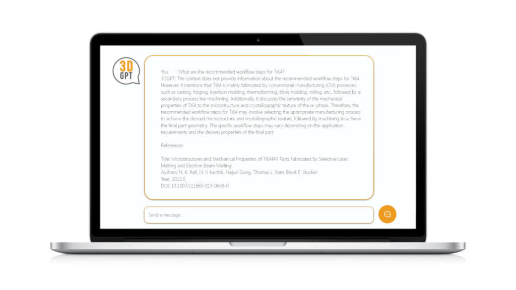 Tot nog toe kun je in gewone woorden vragen stellen aan 3DGPT, specifiek over het thema additive manufacturing. De algoritmen die het antwoord formuleren vallen hiervoor terug op zowel de algemene kennis waarop OpenAI’s ChatGPT is gebouwd alsook op allerlei specifieke publicaties over additive manufacturing. De ontwikkeling van 3DGPT is ondersteund door Innovate UK in het programma SAMCRD, Scalable AM Rule Creation & Dissemination.