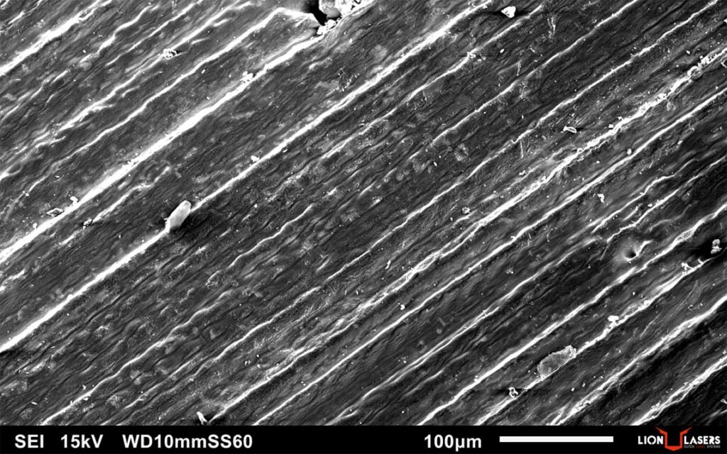 Edwin Kroon heeft voor het experiment een gepulste fiberlaser met een golflengte van 1064 nanometer gebruikt met een vermogen van 60W. Hij laat de laserstraal met een snelheid tussen 1000 en 4000 mm per seconde over het oppervlak gaan, eerst van links naar rechts en dan nog een keer kruislings. Doordat hij de laserstraal heel nauwkeurig kan sturen, kan hij precies de toppen die je ziet als je het oppervlak onder een elektronenmicroscoop bekijkt, smelten en weer laten stollen zodat de dalen opgevuld worden. Op die manier verbetert de oppervlakteruwheid aanzienlijk. Tegelijk verandert de hardheid amper omdat hij niet meer energie in het werkstuk brengt dan nodig is. “De hardheid ging van 50 HV naar 51, niet veel, het wordt zeker niet bros”, zegt Edwin Kroon.