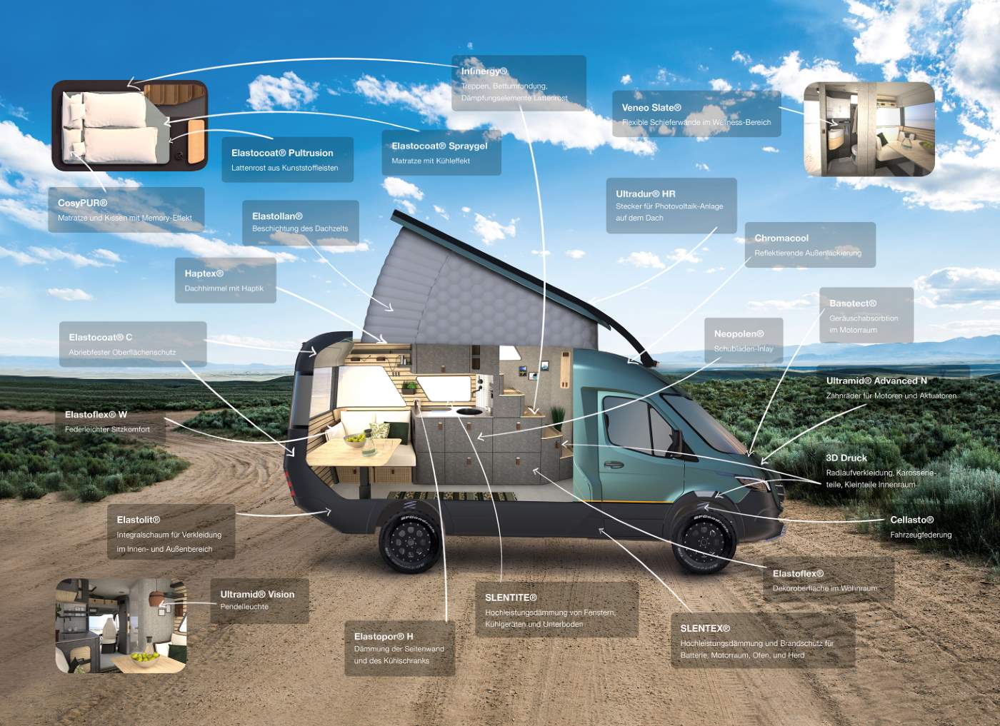 De materialen zijn inmiddels geschikt voor zowel onderdelen voor het interieur als voor het exterieur van kampeerwagens. Met coatingssystemen van andere BASF bedrijven kunnen de 3D geprinte onderdelen gekleurd en verder afgewerkt worden. “Voor de digitale productie van de toekomst is 3D printen een sleuteltechnologie” zegt Volker Hammes, vice president business build-up bij BASF 3D Printing Solutions. In de conceptstudie van de camper laten Hymer en BASF zien wat mogelijk is met moderne kunststoffen, ook qua functionaliteit om met speciale lakken bijvoorbeeld de temperatuur in de camper met 4 graden te reduceren. Bijzonder is natuurlijk dat meer dan 100 onderdelen 3D geprint zijn. Dit zijn zowel interieur- alsook exterieur delen. Carrosseriedelen zijn geprint, maar ook grijpers, haakjes en de bekleding van de wielkasten. Deze laatste onderdelen zijn daarna afgewerkt met Elastocoat C, een speciale Polyurea spuitcoating van BASF. Deze coating levert een duurzame bescherming tegen steenslag, krassen en vlekken.