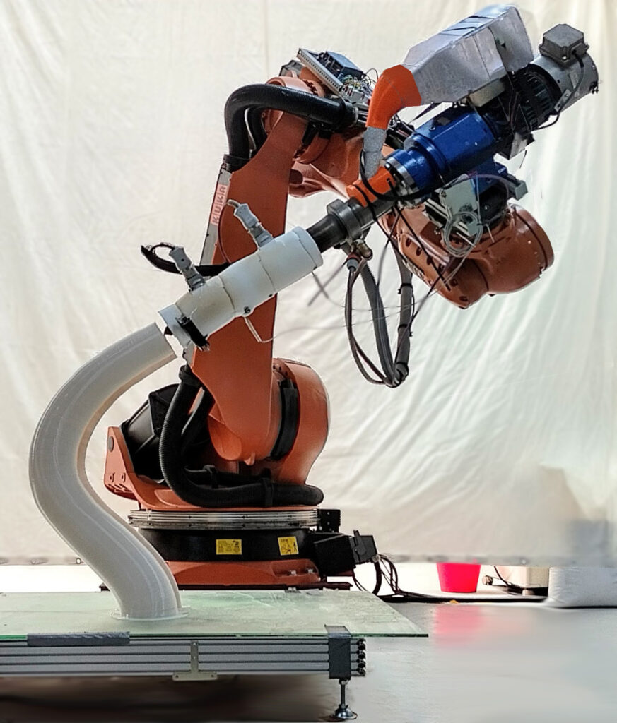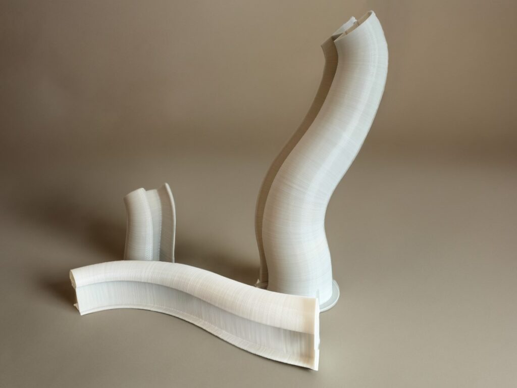 ShapeService is gewend grote stukken te printen met de robottechnologie die het zelf ontwikkelt. In dit geval lukt het echter niet met een standaard cartesische printmethode. In de soms wel anderhalve meter lange wortelsegmenten waren parallel lopende lagen bovendien esthetisch ongewenst. ShapeService heeft daarom een nieuwe slicer ontwikkeld zodat ze met de 6-assige Kukarobot zowel non-planar als multi-planar konden 3D printen. Hierbij volgt de laagrichting constant de kromming van de wortel door het hele stuk, tot wel anderhalve meter lang. Met de extruder aan de robotarm werd soms onder hoeken tot 80 graden geprint. Tijmen Huetink: “Dat levert dezelfde hechting op.”