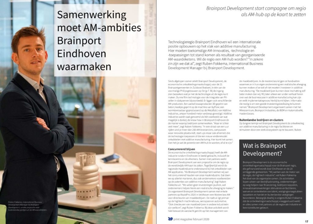 “In een straal van een uur rijden vind je meer dan 200 AM-leveranciers, campussen waar innovatie plaatsvindt, start-ups maar ook afnemers die de technologie toepassen of die een nieuw verdienmodel ontwikkelen met additive manufacturing. Hier komt het samen. Dan heb je wel de potentie een AM hub te worden; of al te zijn”, zo zegt Ruben Fokkema in een interview met 3D Print magazine. Samen met partners werkt de economische ontwikkelingsmaatschappij aan een propositie om de regio op de wereldwijde AM-kaart te zetten. Tegelijkertijd wordt de regionale maakindustrie ondersteund bij het ontwikkelen van AM applicaties. “Als Brainport Development werken wij aan het concurrerend houden van onze maakindustrie. Dat doen we op allerlei manieren, dus ook ondernemers voorbereiden op de potenties van additive manufacturing.”