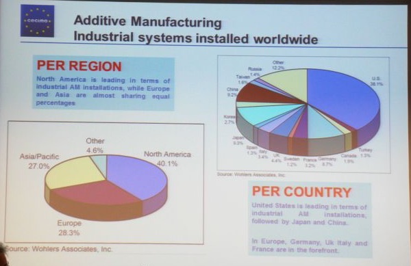 Europa dreigt bij deze landen achterop te raken, mede door het kennisgebrek op het vlak van 3D printen. In de VS staan de meeste 3D printers (ruim 40% van de wereldwijde installed base); Azië en Europa hebben praktisch een evengrote installed base. Belangrijk is, zegt de CECIMO-projectmanager, dat er zowel succesvolle toepassingen ontwikkeld worden, er meer en betere scholing komt (“we moeten HR mensen bewust maken”) en er werk wordt gemaakt van standaardisatie van processen en materialen. CECIMO brengt momenteel sectoren in kaart waarin 3D printen wel al wordt toegepast. “We werken aan een identificatie van sectoren die voorop lopen in advanced en additive manufacuring, welke regio’s potentie hebben en welke sectoren”, zo liet Giorgio Magistrelli weten.