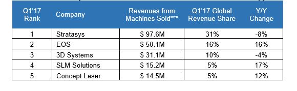 Tegen de algemene trend in het industriële marktsegment in, hebben de fabrikanten van 3D metaalprinters het in Q1 van 2017 heel goed gedaan. Hun verkopen en omzet groeiden. Dat geldt ook voor het middensegment. In de prijsklasse $ 5000 tot 25.000 namen de verkopen in aantallen uitgedrukt zelfs met 31% toe.