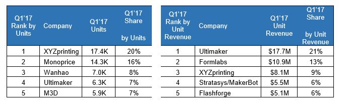 In de Personal Desktop 3D printmarkt is het Chinese XYZprinting marktleider qua aantal verkochte printers. Het Chinese concern – met een Europees distributiecentrum in Nederland – zag de verkopen met 20% toenemen in de eerste drie maanden tot 17.400 printers. Monoprice staat op de tweede plaats (14.300 units), Wanhao derde (7.000) en het Nederlandse Ultimaker op de vierde plek (6.300 printers in één kwartaal geleverd). Ultimaker staat echter wel op de eerste plek als het lijstje wordt opgemaakt aan de hand van de omzet. Het Nederlandse bedrijf haalde uit de verkopen een omzet van 17,7 miljoen dollar (marktaandeel 21%), gevolgd door Formlabs (10,9 miljoen) en XYZprinting 8,1 miljoen). Makerbot (Stratasys) staat hier op de 4e plek met een omzet van 5,5 miljoen dollar. Context zegt over Ultimaker en Formlabs dat beide bedrijven er goed in slagen om de juiste balans te vinden tussen verkochte aantallen en prijs, waardoor ze de beste plekken innemen in de rangorde qua omzetten.
