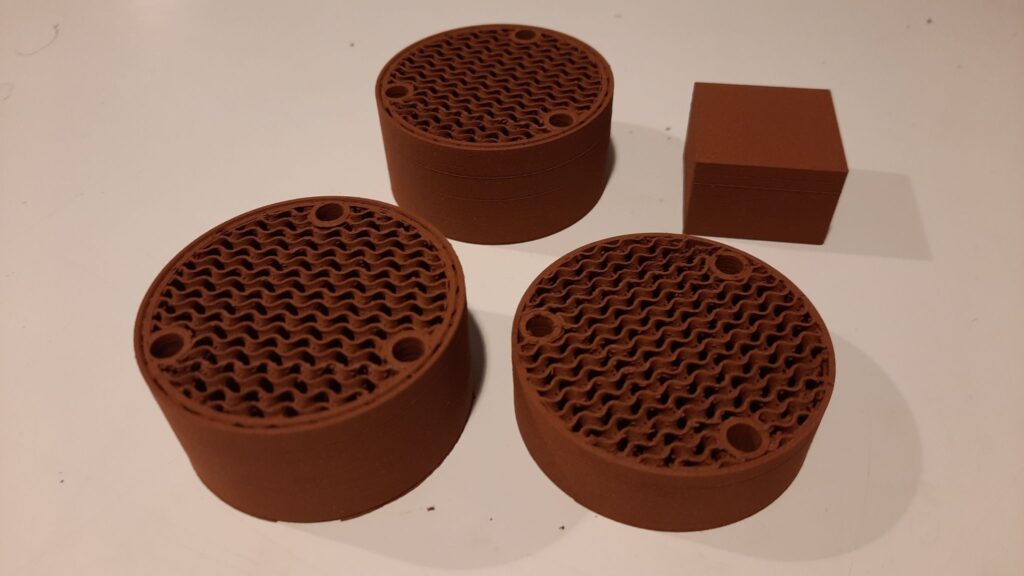 Ook koper kan op deze manier al geprint worden, bijvoorbeeld in warmtewisselaars. Puur koper, 99,8 procent, benadrukt Ortloff. “Wil je dat met een SLM-printer verwerken, dan kun je alleen de groene laser gebruiken. Nu hebben we filament waarmee je puur koperen producten kunt printen.” Albert Falck en Arno Gramsma hebben zelf al het koper filament van Virtual Foundry getest. In het innovatieproject Addcat worden op een Ultimaker met koperfilament katalysatoren geprint. Bij Xerion verwacht men veel van dit materiaal, bijvoorbeeld voor het printen van warmtewisselaars. Ten opzichte van de poederbed gebaseerde metaalprinters biedt dit als voordeel dat er geen los poeder uit interne holtes verwijderd hoeft te worden. “We kunnen dus volledig gesloten onderdelen printen.” Wat ook kan, is een poreus werkstuk printen waarbij de porositeit gebruikt wordt om het onderdeel de juiste eigenschappen voor de toepassing mee te geven. “Met het debinding en sinterproces kunnen we de grootte van de poriën in het werkstuk zelf sturen. Normaal gesproken zoekt men de maximale sintertemperatuur op om een zo hoog mogelijke dichtheid te halen. Bij toepassingen waarin poriën juist belangrijk zijn, gaat men op een lagere temperatuur sinteren.”
