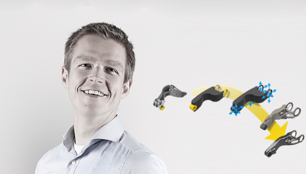 Gilbert Peters heeft een behoorlijke ervaring met 3D printen opgebouwd. Vier jaar geleden heeft hij de eerste Additive World Design for AM Challenge van Additive Industries gewonnen. Hij sleepte destijds de award in de wacht met een bijzonder ontwerp voor de achterwiel ophanging van een elektrische motorfiets. Naast topologie-optimalisatie gebruikte hij de mogelijkheden van 3D metaalprinten ook om functies te integreren. De remleiding en de remklauw konden in het ontwerp worden geïntegreerd, waardoor men van 16 naar 1 component terug ging.