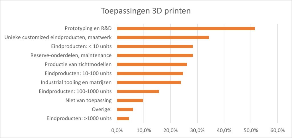 Van de deelnemers aan het onderzoek zegt 67% al 3 tot 10 jaar ervaring te hebben met 3D printen. 51% hiervan zet de technologie in voor prototyping, vaak in combinatie met andere toepassingen. Zo geeft 46% aan dat ze de technologie (ook) inzet voor de productie van finale stukken. Reserveonderelen worden geprint bij 28% van de respondenten (die actief zijn met 3D printing, vanzelfsprekend). De afgelopen jaren hebben veel bedrijven die in-house 3D printen, geïnvesteerd in de hardware (bijna 80%), gevolgd door de software (iets meer dan de helft). Dat ze de technologie toepassen wil niet zeggen dat er geen knelpunten meer zijn. Wel degelijk, zo geven de deelnemers aan. Interne expertise en kennisgebrek zijn de grootste belemmeringen (45%), gevolgd door de hoge investeringskosten (40%) en gebrek aan een goede businesscase (34%). Opvallend genoeg vindt een groot deel wel van zichzelf voldoende van 3D printen af te weten om beslissingen te kunnen nemen. Kris Binon kan dit wel plaatsen. “Hoewel we door het onderzoek samen met andere organisaties uit te zetten ook mensen van buiten onze sector hebben bereikt, hebben we waarschijnlijk toch vooral met een groep te maken waar een zekere frustratie bestaat omdat hun klanten de businesscase niet zien. Misschien hadden we nog meer de mensen die niet printen moeten verleiden mee te doen aan het onderzoek.”