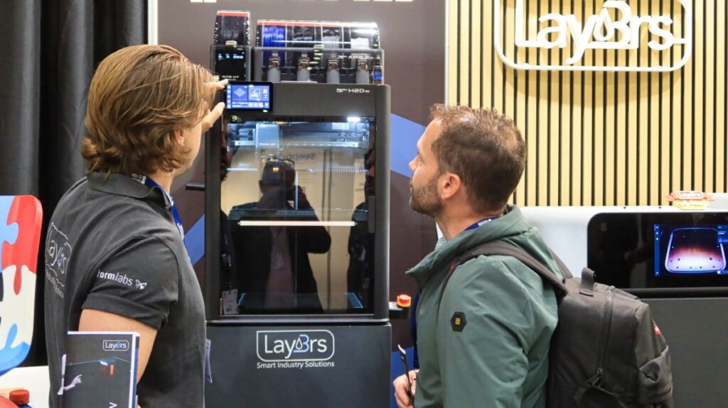 Dat geldt zeker voor de onderdelen die op de nieuwe Bambu Lab H2DPro worden geprint, die Lay3rs voor het eerst op een beurs demonstreerde. Albert Falck toonde zich verrast door de concrete aanvragen voor de nieuwe 3D printer, die onder andere over een verwarmde bouwkamer (tot 65 graden C) beschikt, een droger voor de standaard vier filamentrollen die automatisch ingevoerd worden en de dubbele nozzle. “De Kunststoffenbeurs is niet echt een verkoopbeurs, maar we hebben de eerste dag al direct veel aanvragen gekregen voor deze nieuwe 3D printer.” Dankzij de verwarmde bouwkamer en de nozzle die bestand is tegen temperaturen tot 350 graden C print de H2DPro ook engineering plastics waaronder PPA-CF en PA6-CF.