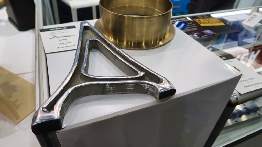 IAMM toonde daarnaast enkele producten van Spee3D, de Australische fabrikant van DED-metaalprinttechnologie die op 24 en 25 september op Perron038 in Zwolle gastheer voor de EMU Euro Tour 2025 van Spee3D. EMU staat voor Expiditionary Manufacturing Unit, twee zeecontainers waarin zowel een metaalprinter geïnstalleerd is als een tweede container met daarin alles om de geprinte onderdelen na te bewerken. De 20 voet containers passen op NATO in-service voertuigen. De aluminium steunarm op de foto weegt 2,4 kg en is geprint in 2 uur. De bus, geprint met een nikkel aluminium brons legering weegt 6,9 kilogram en het printen hiervan kostte Spee3D 2 uur en 1 minuut. De bus is een onderdeel van de marine.
