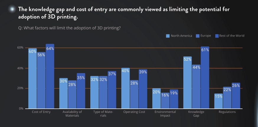 - Om een gangbare productietechnologie te worden, moeten de kosten per onderdeel verder omlaag. 59% zegt dat de instapkosten een drempel zijn voor omarmen van de technologie; 51% ziet gebrek aan kennis als een belangrijke drempel