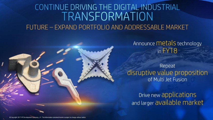 HP kondigt in het fiscale jaar 2018 een eigen 3D metaalprinttechnologie aan. Dat heeft Stephen Nigro, president 3D Printing bij HP, gezegd op een analistendag voor de financiële markten. CEO Dion Weisler heeft op deze bijeenkomst nog eens bevestigd dat HP marktleider in de 3D printindustrie wil worden.