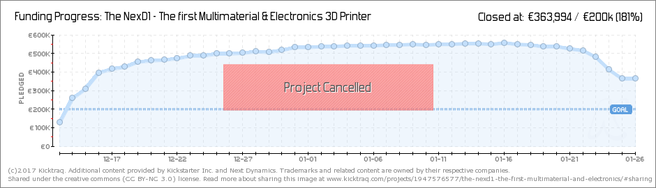 De ontwikkelaar van de NexD1 uit Berlijn trok eind vorig jaar de aandacht door een crowdfunding campagne te starten voor hun multimaterialen 3D printer. Die beloofde toch wel unieke mogelijkheden (hier kun je er alles over lezen). Na de jaarwisseling begon het mis te gaan. Op 10 januari gaf het team op Kickstarter nog achtergrond informatie over het bedrijf, tot nog toe gefinancierd door de privé investeerder en co-founder Alexander Straub. Op LinkedIn staat dat hij CEO en founder is van Straub Ventures en CEO en mede oprichter van Empora Group, een IT bedrijf in de beautywereld dat het social media platform Fashionfreax ontwikkelt en in de lucht houdt.