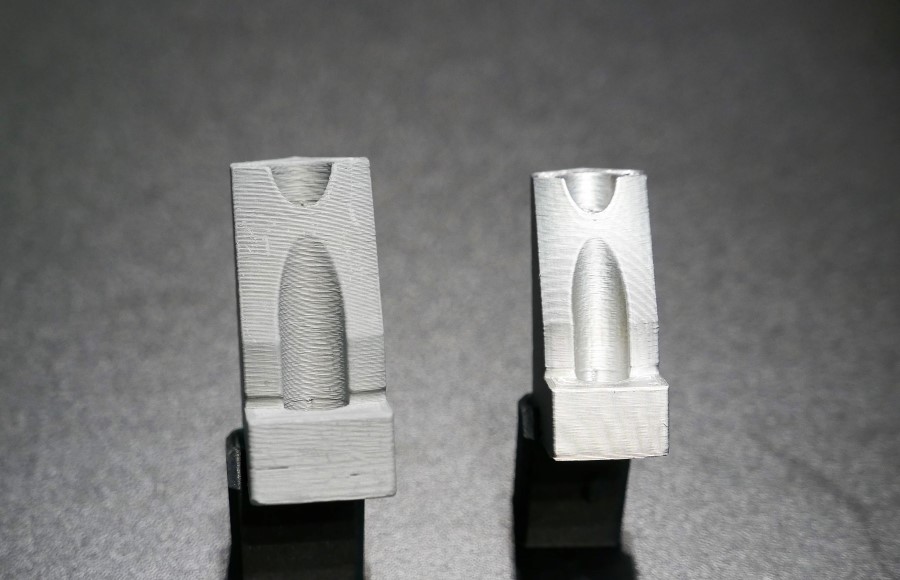 Links het onderdeel zoals het uit de 3D printer komt, rechts na het sinteren.