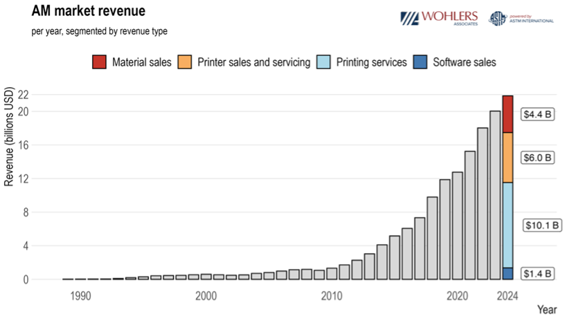 De wereldwijde additive manufacturing industrie is vorig jaar gegroeid naar een waarde van zo’n $22 miljard. Negen procent groei vergeleken met 2023 (om precies te zijn 9,1% tot $21,9 miljard). Deze constatering komt uit het nieuwste Wohlers Report 2025. Dit is voor het eerst volledig samengesteld onder de vlag van ASTM International, dat komende jaren nieuwe wegen wil inslaan met het rapport.