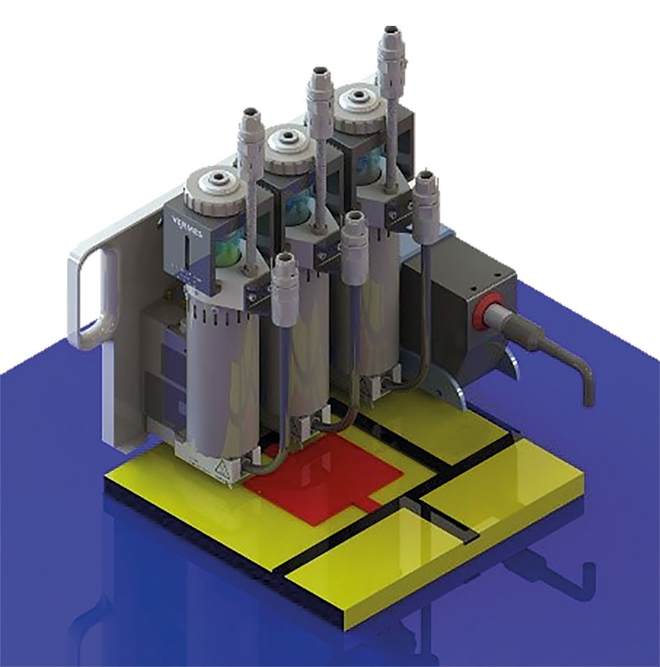 De gemeenschappelijke deler van de materialen die geschikt zijn voor het systeem, is een thermoplastische binder. Het materiaal zelf kan metaal zijn, maar ook keramiek. ”We kunnen tot nog toe vier verschillende materialen tot één product samenvoegen:, zegt Uwe Scheithauer, wetenschapper bij het IKTS. Het proces start met een homogene verdeling van het poedervormig materiaal in een thermoplastische substantie die als binder fungeert. Deze pasta-achtige substantie wordt verdeeld over de vier mikrodoseerunits, waarin de substantie wordt verwarmd tot 100 graden C. Bij die temperatuur laat het materiaal zich precies doseren in de vorm van druppels van 300 tot 1000 µm. Het doseersysteem deponeert computergestuurd zeer nauwkeurig de druppels. Druppel voor druppel wordt het werkstuk zo opgebouwd. Met 1000 druppels en een snelheid van 60 mm per seconde. De laagdikte zit tussen de 100 en 200 µm. De maximale werkstukafmetingen zijn 20 bij 20 bij 18 centimeter. “Het onderscheidende is de afzonderlijke dosering van metaal- of keramische substanties. Deze nauwkeurige dosering zorgt ervoor dat het product na het sinteren de gewenste eigenschappen en functies krijgt”, legt Uwe Scheithauer verder uit.