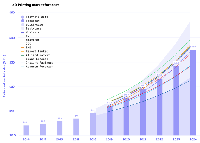 Voorspellen hoe groot de impact op de 3D printindustrie wordt, is lastig. Hij kijkt terug naar de vorige diepe recessies, die van 2001 (dotcom crisis) en die van 2008 (financiële crisis). Beide keren liep de omzet bij de 3D printbedrijven met 15 tot 25% terug en duurde het herstel twee tot drie jaar. Er is wel een verschil met toen: de AM-industrie bevindt zich in een andere fase: de sector is méér gediversifieerd, er is een toenemende accaptie van 3D printen van tooling en eindproducten en bedrijven hebben hun verdienmodellen aangepast zodat ze een grotere continue inkomstenstroom genereren. Alex Huckstepp verwijst naar cijfers die 3D Hubs begin dit jaar presenteerde en waarin sommige onderzoekers de huidige neergang al voorspelden. Digital Alloys verwacht dat de markt 5 tot 20% gaat krimpen als meer data bekend worden.