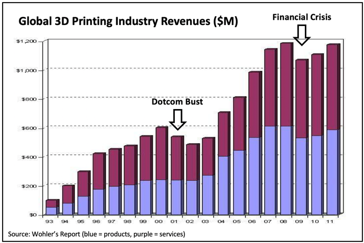 - Tijdens vorige recessies kromp de AM-industrie en vergde herstel 2 tot 3 jaar