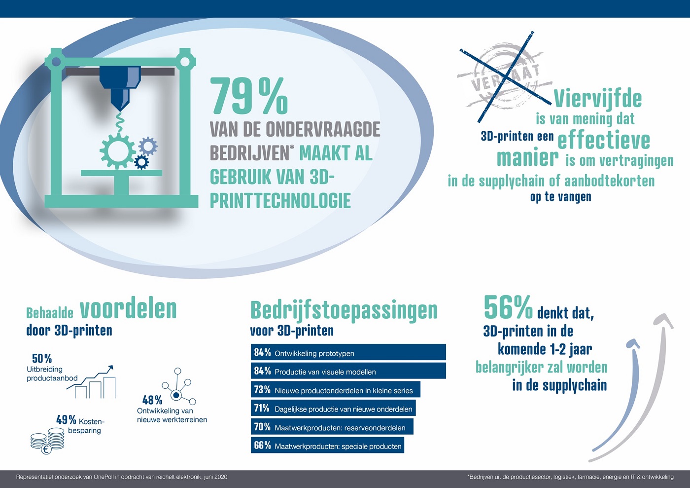 Reichelt elektronik, een van Europa’s grootste onlinedistributeurs voor elektronica en IT-technologie, heeft samen met OnePoll onderzoek gedaan naar de positie van 3D printen in het Nederlandse bedrijfsleven. Men wilde weten hoe wijdverspreid de technologie is, welke impact 3D printen op de bedrijven heeft en welke obstakels er zijn. Ook het thema covid-19 is meegenomen: welke impact heeft deze en hoe kijken bedrijven tegen de rol van 3D printen aan om leveringsonderbrekingen op te lossen? De deelnemende bedrijven komen uit de productiesector, de logistiek, de farmaceutische industrie, de energiesector en IT & development. Zoals te verwachten viel, wordt 3D printen vooral ingezet voor prototyping (84%). 73% gebruikt 3D printen voor de productie van kleine series onderdelen; 66% print maatwerkonderdelen.
