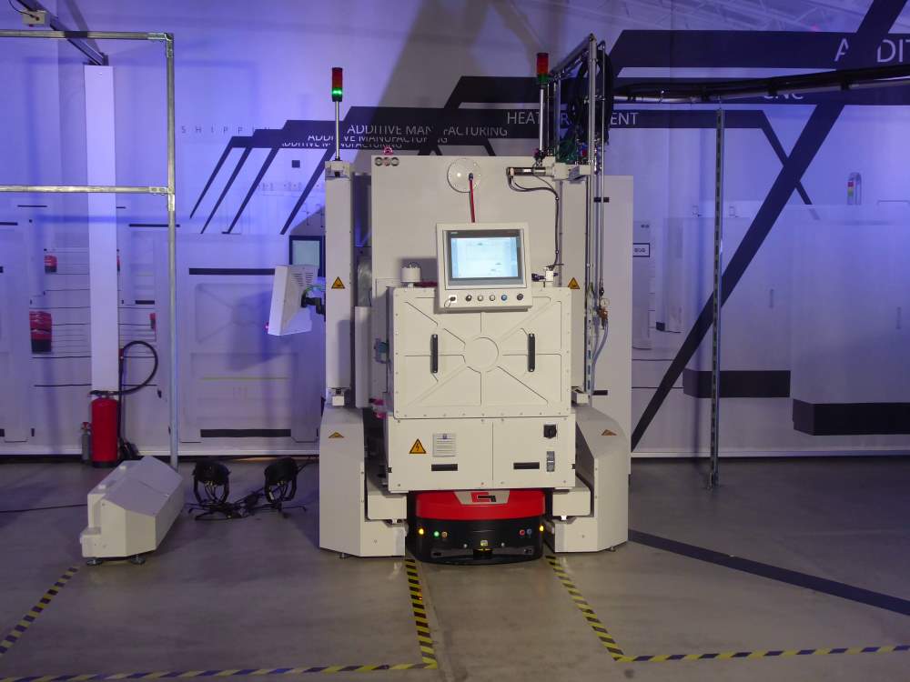 De complete bouwkamer wordt zodra de buildjob op de EOS M 400-4 klaar is door een automatisch transportsysteem uitgenomen en naar het uitpakstation gebracht. Hier wordt afhankelijk van de geometrie van het werkstuk tot 98% van het poeder automatisch verwijderd. Het projectteam verwacht dat dit nog verder geoptimaliseerd kan worden tot zelfs 99%. Overtollig poeder wordt automatisch teruggevoerd naar het poederstation van EOS. Hier wordt het gezeefd en bruikbaar metaalpoeder wordt opnieuw naar het AM-systeem gevoerd.