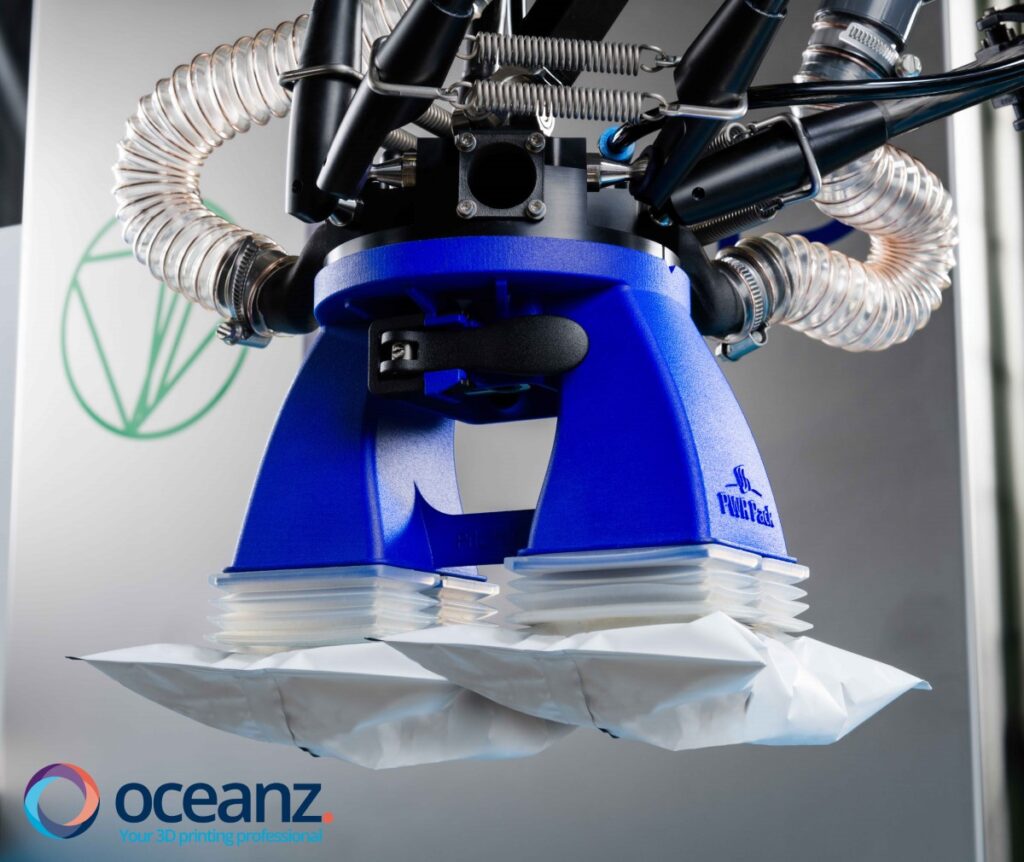 Oceanz kiest bij projecten in de voedingsmiddelenindustrie standaard voor PA12 Blauw, mede omdat het materiaal door en door blauw is en het met een constante kwaliteit geprint kan worden. Het metal detectable PA12 Blauw wordt op projectbasis aangeboden, alleen als de klant dit nodig heeft. ‘Als je metaal toevoegt ,wordt het kunststof zwaarder. Dat kan bij grippers een issue zijn; dan gaat het juist om zo licht mogelijk te construeren.” Oceanz levert de onderdelen geprint in de Food Grade materialen inclusief certificaten, zodat de machinebouwers aan de eindklant kunnen aantonen dat de materialen voedselveilig zijn en ze conformeren aan alle internationale wet- en regelgeving.