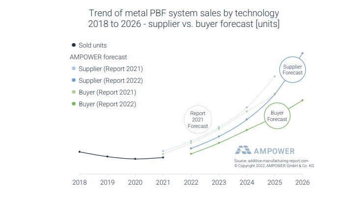 Een interessant punt dat de consultants van AMPower eigenlijk elk jaar wel aanhalen, is het verschil in verwachting bij de leveranciers van poederbed systemen en de gebruikers ervan. Er gaapt soms een diepe kloof tussen de verwachtingen die beide partijen uitspreken. Dit jaar is dat bijvoorbeeld zo als het gaat om de groei van de verkoop van systemen voor metaalextrusie. Leveranciers van deze systemen denken dat ze over enkele jaren een marktaandeel halen van 20%; gebruikers houden het op hooguit 3%. En iets soortgelijks zie je als de vraag gesteld wordt naar de groei van de verkopen van poederbed systemen voor metaal. Afgelopen jaar werden wereldwijd 1.533 units verkocht, nog altijd minder dan in het record jaar 2018. Verleden jaar voorspelden de verkopers zo’n 1.739 systemen te gaan verkopen. Dat is dus niet gelukt. Zelfs de meer gematigde verwachting van de kopers, die dachten in 2021 1.645 AM systemen de kopen, is niet gehaald. Dit jaar schrijven de consultants dat het opvalt hoe beide groepen de verwachtingen temperen.