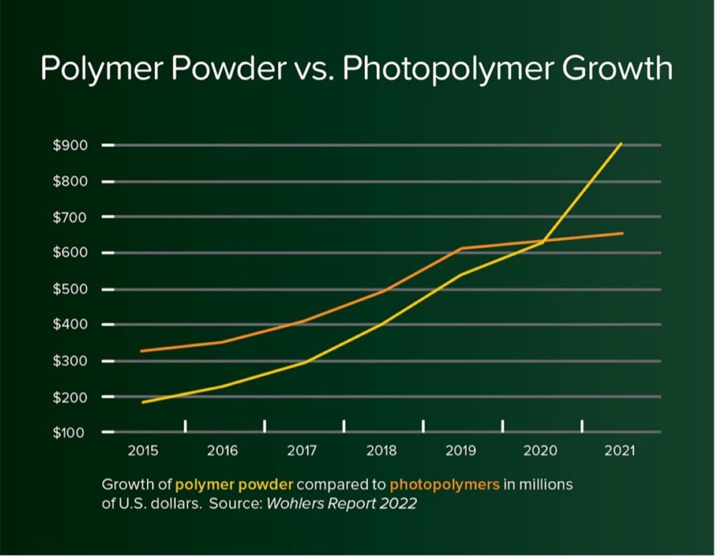 De vraag naar polymeer poeder voor additive manufacturing zit al sinds 2015 in de lift. Eind 2020 is de markt in een versnelling geraakt en vorig jaar is deze qua omzet gegroeid naar $900 miljoen, zo’n $250 miljoen meer dan de markt voor fotopolymeren. De cijfers tonen duidelijk aan dat die markt de laatste drie jaar maar mondjesmaat groeit. Kunststof poeder voor 3D printen is nu het meest gebruikte materiaal in de hele AM-industrie.