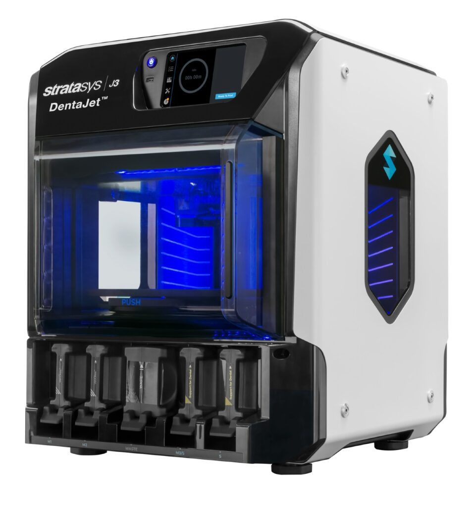 Het gaat hier om een multimaterialen 3D printer. In één build kan men 3 verschillende materialen én supportmateriaal printen (de J5 DentaJet 5 kan er 5) De compacte printer is onder andere geschikt voor de verschillende biocompatibele materialen (zowel helder, vast als flexibel). Met de printer kan men in één build verschillende producten printen, zoals modellen voor implantaten, chirurgische mallen, gingiva maskers als ook kronen, bruggen et cetera. De J3 beschikt over dezelfde roterende bouwplaat en gebruikt de PolyJet technologie van Stratasys. (maximaal bereik is 140 bij 200 bij 190 mm). De print worden tijdens het printproces al uitgehard, zodat post processing tot een minimum wordt gereduceerd. In ruim 3 uur print de machine 37 aligners; in 4,5 uur 64 modellen voor kronen en bruggen. De Stratasys J3 DentaJet wordt geprogrammeerd met de GrabCAD software.
