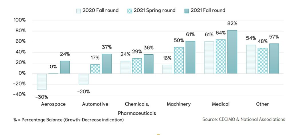 Opvallend in de resultaten van het derde onderzoek is dat heel veel signalen voor additive manufacturing op groen zijn gesprongen, als ze dat al niet stonden. Misschien wel het meest zeggend onderwerp in het onderzoek is de business trend. De medische sector blijft de meest krachtige als het om additive manufacturing gaat. 82% van de deelnemers rekent er op komend half jaar verder te groeien. Opvallend is het resultaat in de luchtvaartindustrie. Eind 2020 voorspelden de luchtvaartbedrijven nog een krimp van 30% te verwachten wat additive manufacturing orders betreft. Na neutrale verwachting in het voorjaar is de sector nu duidelijk begonnen met ene inhaalslag: 24% rekent op groei in het komend half jaar. In de automobielindustrie neemt dat percentage toe van 17% in het voorjaar tot 37% nu. CECIMO zegt in een toelichting dat dit enerzijds komt door het herstel van de sector, anderzijds doordat de huidige onderbrekingen van de supply chain additive manufacturing in de kaart speelt. Na de medische industrie blijft de machinebouw de sector met de tweede sterkste groeiverwachtingen.