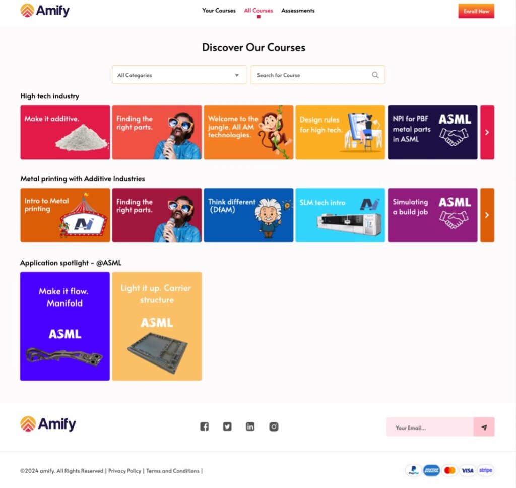 Additive Center ontwikkelt daarom een nieuw leerplatform, Amify. Dit gebeurt met ASML en de NS als pilotklanten. Tijdens de workshop zal Maarten van Dijk Amify officieel gaan lanceren als leerplatform waar iedereen in de keten uit tal van modules een op maat gesneden opleidingspakket kiest. Of het nu om de design engineer gaat, de werkvoorbereider of de inkoper die met AM te maken heeft. Vandaar de naam Amify, geïnspireerd door Spotify. “We gaan de kennis uit de industrie bundelen en voor de gebruiker vertalen in individuele leertrajecten voor zowel binnen de OEM’s als ook in de toeleverketen. Vergelijk het met legoblokken: je bouwt je eigen leertraject”, legt Van Dijk uit. In eerste instantie ontwikkelt hij Amify voor de waardeketen van de semicon industrie, meer specifiek ASML. Later worden ook andere sectoren zoals olie- en gas en de luchtvaartindustrie aan Amify toegevoegd. Deels zullen dit dezelfde leerblokken zijn, deels zijn ze specifiek op zo’n industrie afgestemd. Maarten van Dijk: “Bedrijven kunnen dit ook intern gebruiken. Nu is de kennis van additive manufacturing vaak geconcentreerd in een klein team. Door de kennis intern breder te verspreiden, krijg je een versnelling in de toepassing van AM. Hiermee ontsluiten we het opschalen van 3D printen.”