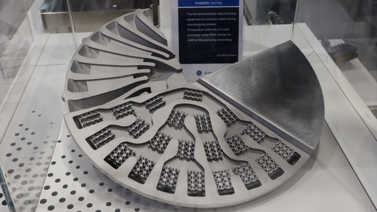 Foto: een studie van GE Additive naar het printen van een waferchuck met geïntegreerde koelkanalen. Het onderdeel is geprint op een Concept Laser M2 Series 5.