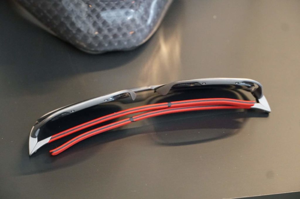 Een heel bijzonder feature is het scharnier van de linker- en rechter brilveren. Deze zijn ontworpen naar het voorbeeld van de scharnieren in de portieren van een McLaren sportwagen. Deze deuren draaien naar boven open. Hetzelfde principe gebruikt Materialise in deze bril. Wil je de bril dichtklappen om op te bergen, dan duw je de veren naar beneden. Hierdoor zullen ze zich langs de onderkant van de bril samenvouwen, met als resultaat dat de samengevouwen bril heel dun is; dunner dan andere brillen.