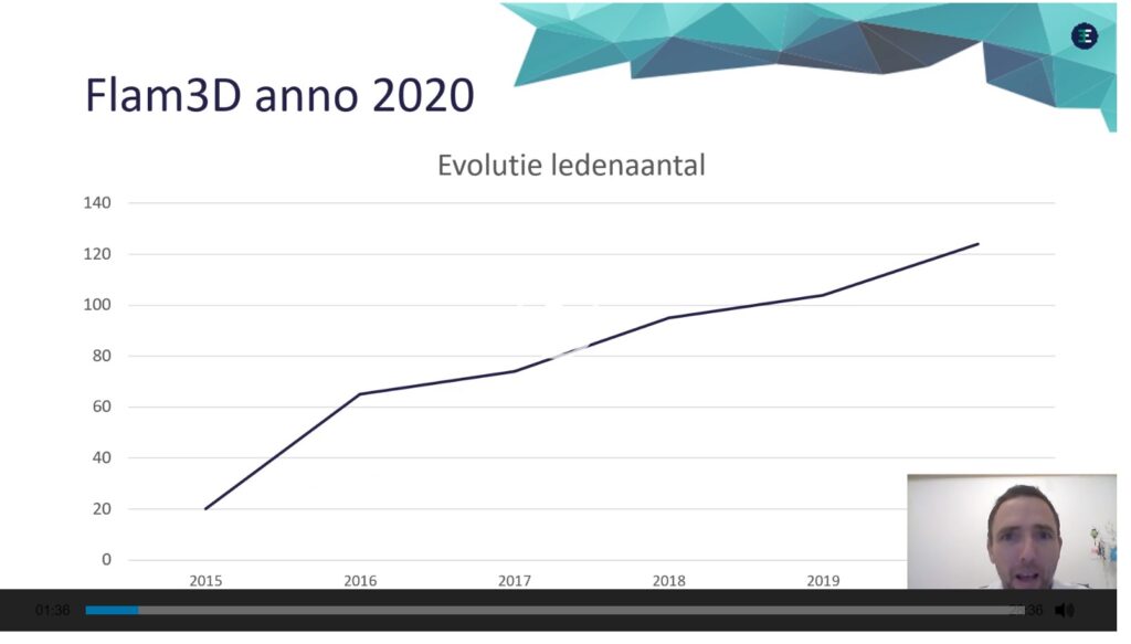 De groei van het aantal leden is dit jaar onverminderd doorgegaan, zo laat Flam3D directeur Kris Binon weten in zijn alternatieve terugblik op 2020. In een normaal jaar presenteert hij deze tijdens een ledenevent; vanwege de beperkingen door de Coronapandemie is Kris Binon dit keer uitgeweken naar een opgenomen online presentatie. Na RapidPro in maart heeft ook Flam3D de aandacht moeten verschuiven van fysieke evenementen naar online activiteiten. Dat de groei van het ledenaantal niet is afgezwakt, is veelzeggend over de mate waarin 3D printen voet aan de grond begint te krijgen.