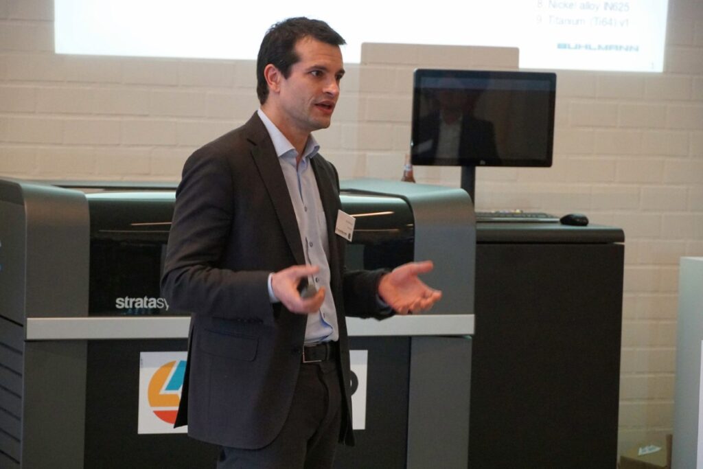 Praktijkcases waren er van de leden. Willem Van Cauwenberge, hoofd engineering bij MT3D, een metaalprint servicebedrijf, maakte aan de hand van een concrete toepassing uit de machinebouw duidelijk wat de impact van design is. Het gaat om een onderdeel dat MT3D in batches van zo’n 100 stuks 3D print voor een machinebouwer, die het stuk eerder samenstelde uit meerdere componenten. Dat heeft MT3D allereerst teruggebracht tot nog 2 onderdelen. “Minder assemblage dus minder kosten”, aldus Van Cauwenberge over één voordeel voor de machinebouwer. Door verschillende designiteraties is MT3D erin geslaagd om de printtijd van het onderdeel met 20% te verkorten, supportstructuren te elimineren en daardoor de nabewerkingen te vermijden. “En hierdoor verbetert de betrouwbaarheid van het AM-proces.” MT3D in Kuurne print ondertussen op vier metaal 3D printers, twee van Trumpf en twee van Eplus 3D.