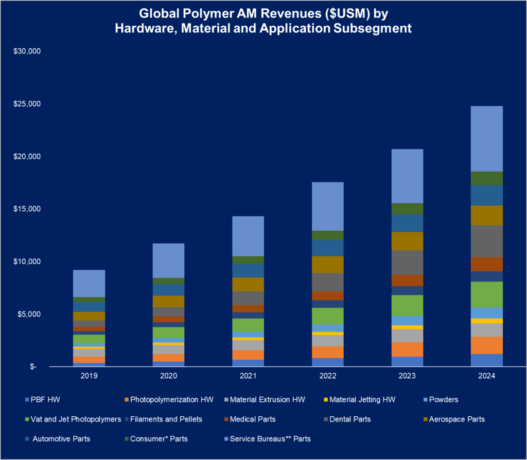 Een interessant detail in dit rapport is dat SmarTech Analysis verwacht dat Polymer Powder Bed Fusion zich ontwikkelt tot de standaard, zowel lasersinteren als thermisch gebaseerde processen. Vanwege de hoge productiviteit en de potentie om onderdelen seriematig te gaan printen heeft deze techniek de meeste aantrekkingskracht op de maakindustrie. Tegen 2024 zal deze technologie samen met SLA en DLP de koplopersrol van materiaal extrusie technieken (voornamelijk filament) overnemen, althans wat betreft de omzet uit verkoop van hardware.