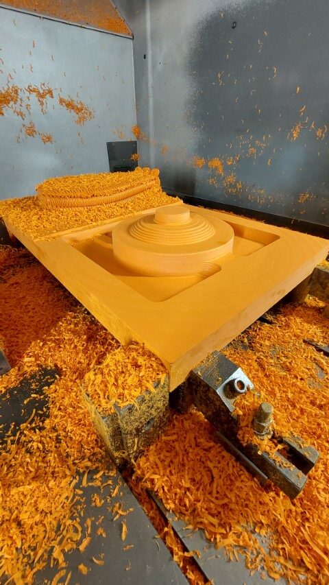 KraussMaffei werkt in de powerPrint, de groot formaat 3D printer, onder andere met gerecycled PETG met 30% glasvezelversterking. Voor het frezen van kunststoffen zijn andere machines nodig dan voor metaal, omdat het snijproces eenvoudiger is en er meer materiaal moet worden weggenomen. Daarom worden minder krachtige maar zeer dynamische machines gebruikt om de hoogst mogelijke snijsnelheden en snelle productietijden te bereiken. De gebruikte gereedschappen moeten extreem scherp zijn en een optimale spaanafvoer vereisen. Tijdens tests met het met frezen van glasvezel versterkte PET ontdekte Thorsten Richter, teamleider van de freeswerkplaats in Harderberg, zelfs “dat met diamant gecoate frezen nodig zijn om het abrasieve materiaal te weerstaan. Dit vermindert de slijtage aanzienlijk.”