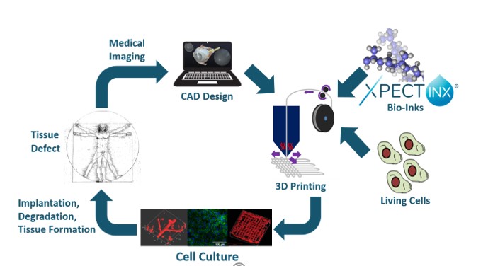 3D printen voor medische toepassingen blijft tot nog toe vooral beperkt tot het printen van implantaten, chirurgische hulpmiddelen en anatomische modellen. Dit komt door het gebrek aan materialen die de structuur en functie van biologische weefsels kunnen nabootsen. Deze structuur is een voorwaarde om te kunnen groeien en functioneren zoals normale menselijke cellen, totdat het lichaam ze volledig integreert. “De sleutel hiervoor is het gebruik van gepaste en biocompatibele materialen, “bio-inkten”. Dat zijn materiaalmengsels, vaak op basis van polymeren, die een sterke gelijkenis vertonen met de natuurlijke, extracellulaire omgeving”, zegt Jasper Van Hoorick, co-founder van de Gentse start-up Xpect-INX.