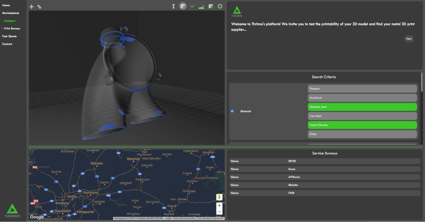 De Vlaamse startup Thrinno lanceeert een online marktplaats voor metal additive manufacturing. Thrinno Marketplace is echter méér dan een matchmaking tool voor de 3D metaalprint wereld. Gebruikers kunnen ook online hun ontwerp controleren op printbaarheid. Dat kan via een design check toolbox, die vrij beschikbaar is voor gebruikers van het Thrinno platform.