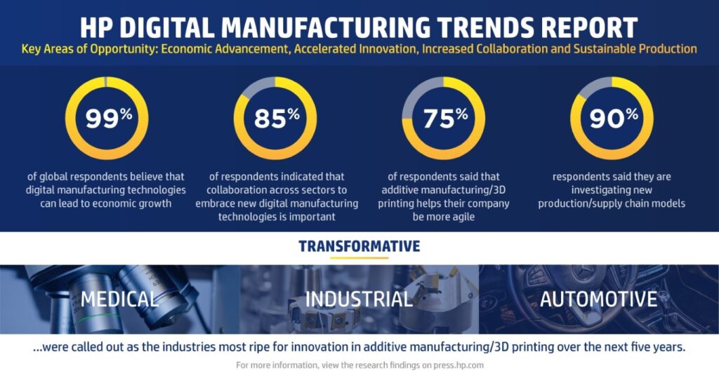 Enrique Lores, President en CEO van HP Inc. zegt in een toelichting dat de covid-19 pandemie de acceptatie van nieuwe technologieën en de digitalisering versnelt, op alle vlakken van de samenleving. Ook in de verdienmodellen van bedrijven. “De pandemie is een belangrijk moment geweest voor 3D printen omdat we de waarde ervan hebben kunnen demonstreren.” Daarnaast ziet hij dat er vanuit een geopolitiek perspectief veranderingen ontstaan in de manier waarop producten worden gemaakt en gedistribueerd. Liefst 99 procent van de bedrijven ziet digital manufacturing als middel voor economische groei.