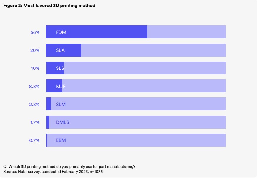 De groei van de AM-markt is volgens het trendrapport minder robuust geweest dan een jaar eerder voorspeld. Hubs verwachtte in 2021 dat de markt zou doorgroeien naar $18,3 miljard; de teller is blijven steken bij $17 miljard. Voor 2023 verwacht men een groei naar $19,9 miljard. Hubs komt hiermee op een groeipercentage uit van 17% op jaarbasis. De luchtvaartindustrie is de belangrijkste gebruiker van additive manufacturing. Automotive en de medische industrie staan op plek 2 en 3.Een kwart heeft een gemiddelde productierun van 1 tot 10 onderdelen, 27% van 11 tot 50 onderdelen en 24% print per keer tussen de 51 en 100 onderdelen.