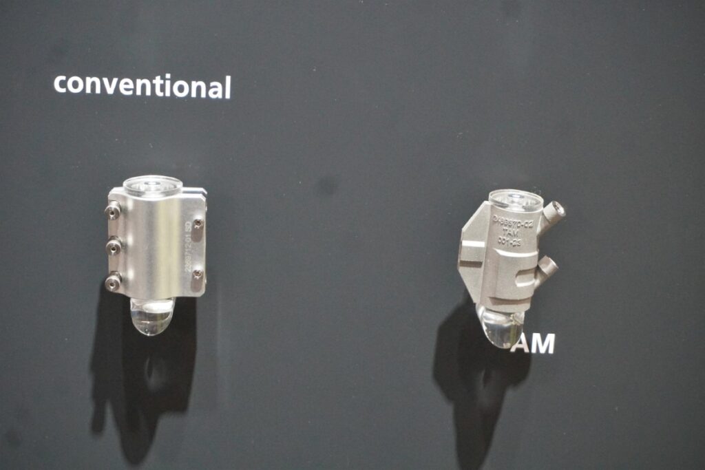 Na vragen over deze toepassingen, geeft Trumpf voor het onderdeel van de TruLaser 5030 de voordelen prijs. Het gewicht is door het te optimaliseren voor additive manufacturing, verminderd van 76,5 gram naar 40 gram. Het volume is 74% kleiner, nog maar 5 cm3 versus 19 in het conventionele concept. De winst zit onder andere in het verminderen van het aantal onderdelen. Het oude onderdeel werd samengesteld uit 10 losse componenten; nu 3D print Trumpf het onderdeel in één geheel, tegen 60% van de kosten. Wat levert het de gebruiker van de lasersnijmachine op? Meer koelcapaciteit. Door het onderdeel van de motorkoeler additief te produceren, verbetert de koelcapaciteit met 5%. Bij Trumpf ziet men ook andere sectoren, buiten de dentale industrie, additive manufacturing toepassen. René Kreissl noemt concreet Sennheiser, fabrikant van koptelefoons. Maar de technologie is volgens Trumpf nog niet zover voor de productie van miljoenen onderdelen, bijvoorbeeld voor de automotive industrie.